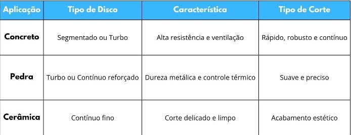 ● Disco diamantado para concreto: ideal para cortes em concreto simples, armado, blocos e pisos. Deve ter segmentos reforçados, soldagem a laser e liga metálica resistente ao atrito com ferragens.