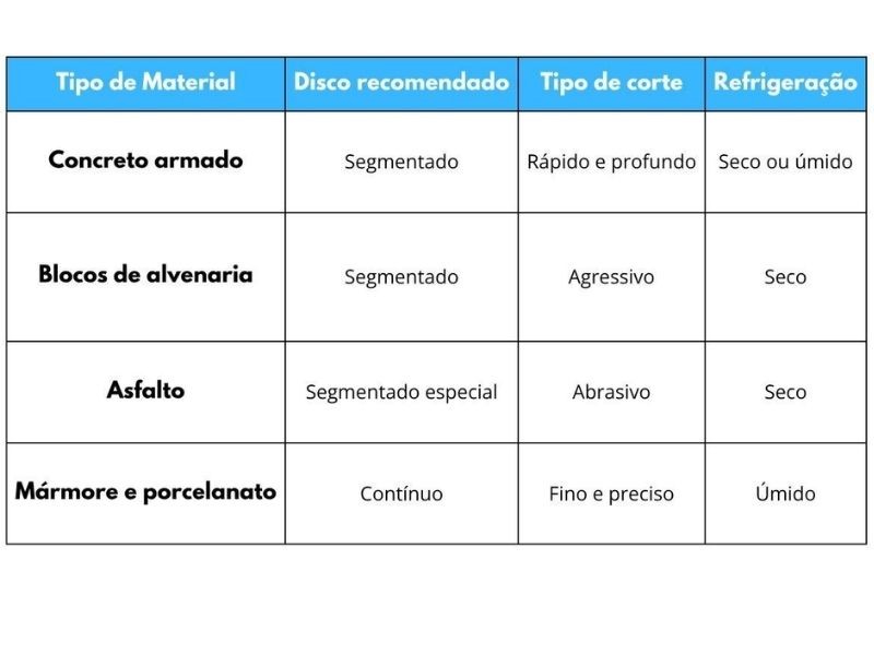 ● Condição de corte: para corte seco, prefira os modelos com ranhuras ou segmentos; para corte úmido, o disco contínuo é o mais eficiente.