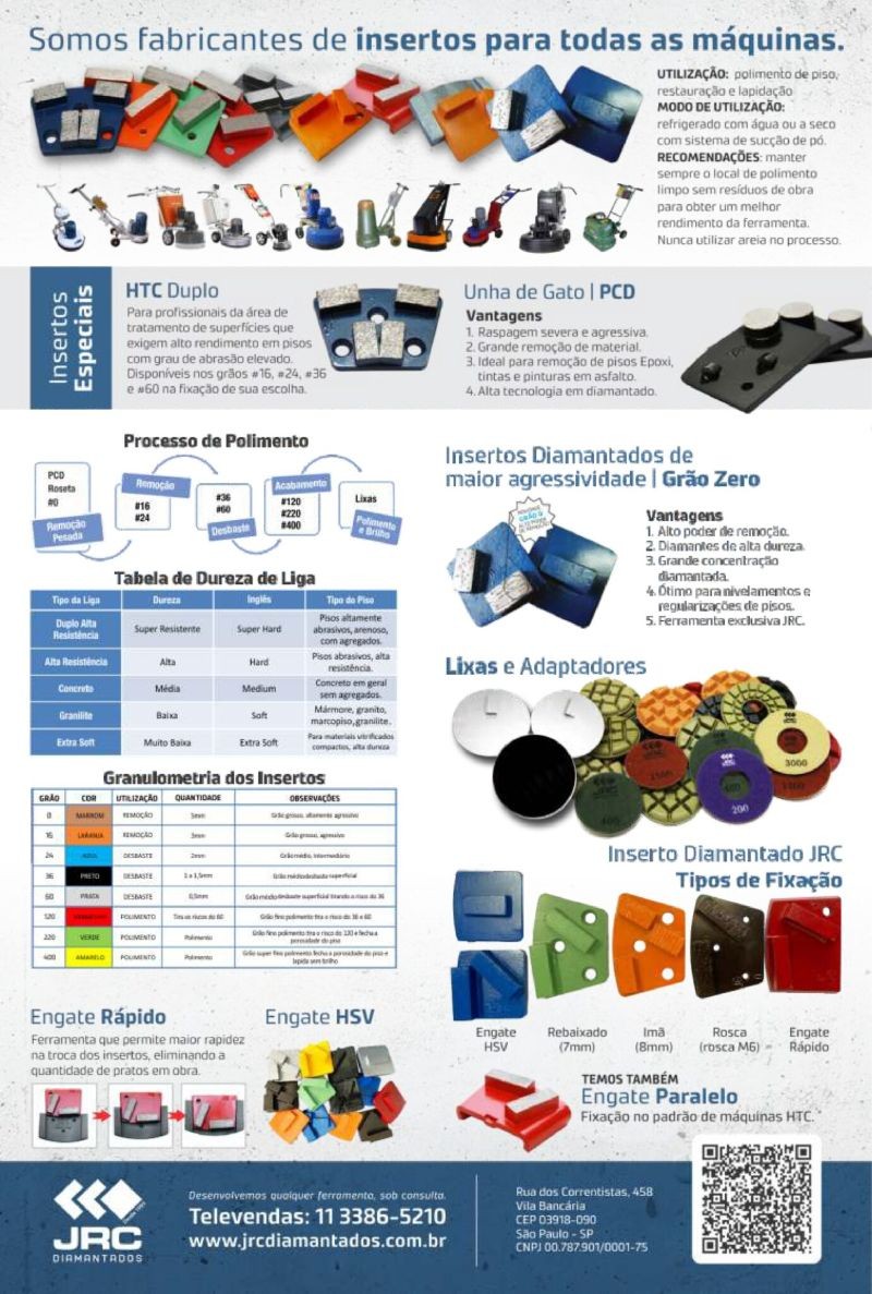 Para que nossos clientes tenham melhores resultados em suas obras é fundamental a escolha correta do inserto. Sabedores disso nos preocupamos muito com as informações técnicas dos insertos diamantados, para isso disponibilizamos abaixo uma série de imagens que ilustram os mais variados tipos de insertos e suas aplicações, a começar com processo de polimento diamantado, granulometria e tabela de dureza de nossos insertos.