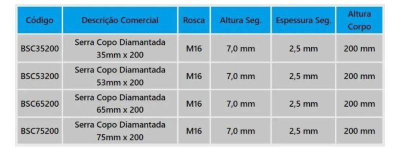 Nossa Serra Copo Diamantada Longa possui 200mm de corpo o que proporciona rapidez e agilidade em sua obra. Com alto poder de corte seu avanço e o mais rápido do mercado.